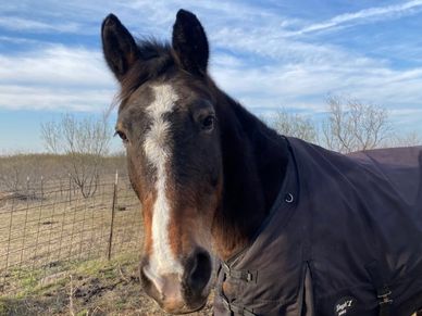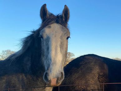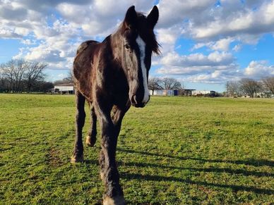 Apollo, a 10-month-old blue Percheron colt, found himself labeled as tag number 302 at the Elkhart auction. Enduring the auction twice, he appeared increasingly defeated each time. A well-known horse trader insisted on $5000, making it challenging to secure his freedom. Finally, when he showed up to run in the auction for the third week in a row, 1 Horse @ A Time Draft Rescue stepped in, paying his ransom. Michelle Patterson, President/CEO of Guardian Therapeutic Horsemanship, became his foster mom for the next year and a half. Upon going to pick him up from the auction, she discovered a disheartened baby with a crooked front left leg. Calling him “Neil," he battled depression, sadness, and a fever of 107. It was then that he had his first trip to Texas A&M's equine hospital, where he spent weeks in the ICU for severe pneumonia and underwent numerous rounds of IV antibiotics. It was a miracle he survived. When he was well enough, she took him back home to continue recovering. Later, they returned to Texas A&M for surgery on his “crooked leg”, hopefully to straighten it enough to give him a chance at survival and a “normal” life. He spent three long months on stall rest to heal from the surgery, during which his personality started to shine, but he always remained very well-behaved, despite his rough beginnings, and being confined. Finally at the end of the third month, he had the green-light to go outside. His pasture mate was a miniature, and they became the best of friends. He captured the hearts of everyone at Guardian therapeutic horsemanship and remained true to being a true gentleman. Neil loves life and is a sweet and loving boy. Not knowing if he can ever be ridden, or if the screw in his leg will ever need to come out, we adopted him from 1-Horse @ a Time Draft Rescue. We continued to ensure his continuity of care and sent weekly photos of his healing leg to Foster Mom Michelle, his orthopedic surgeon at A&M for about a year. This past year he was released from care at A&M by his orthopedic surgeon, but we keep in touch every so often, just because. Today, his full name is Neil Armstrong, and he goes by “Apollo,” because of his extraordinary abilities to overcome enormous obstacles, and because we love him to the moon and back! Apollo is on a special supplement to help ensure healthy growth.