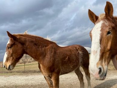 Bill and Mitch are a bonded pair of Belgians, who are former Amish work horses, rescued from a kill pen (tags 225 & 224) who were heading to a meat market in Mexico. They are truly "gentle giants" at 18 and 18.1 hands. After years of hard work, they are finally able to rest and relax, and just enjoy life.